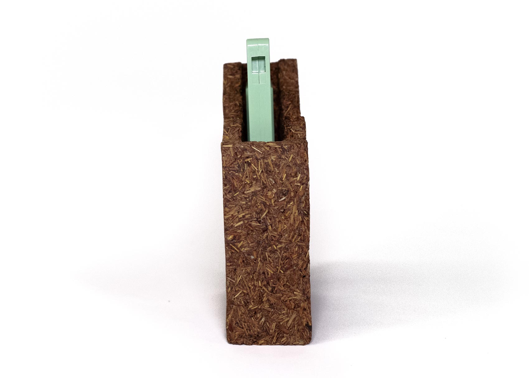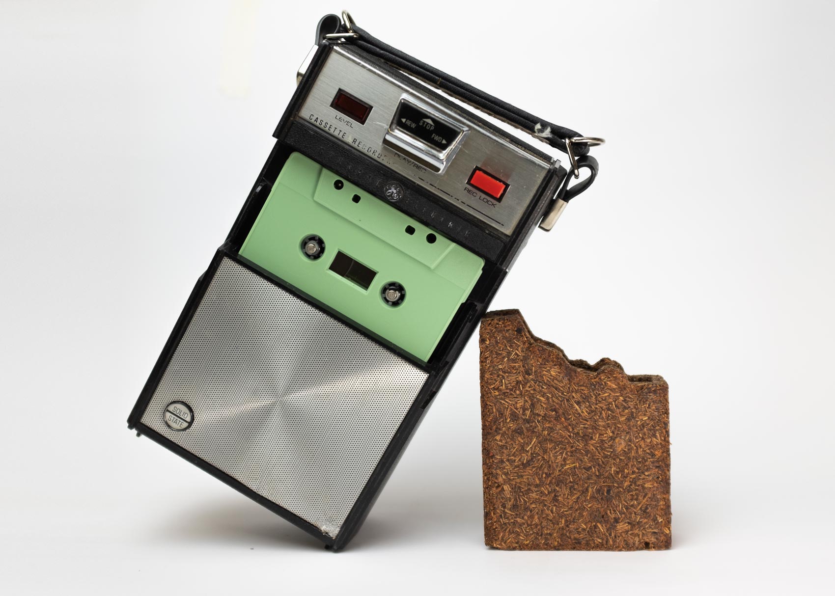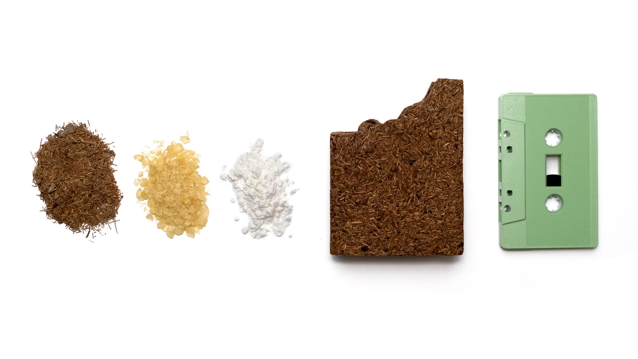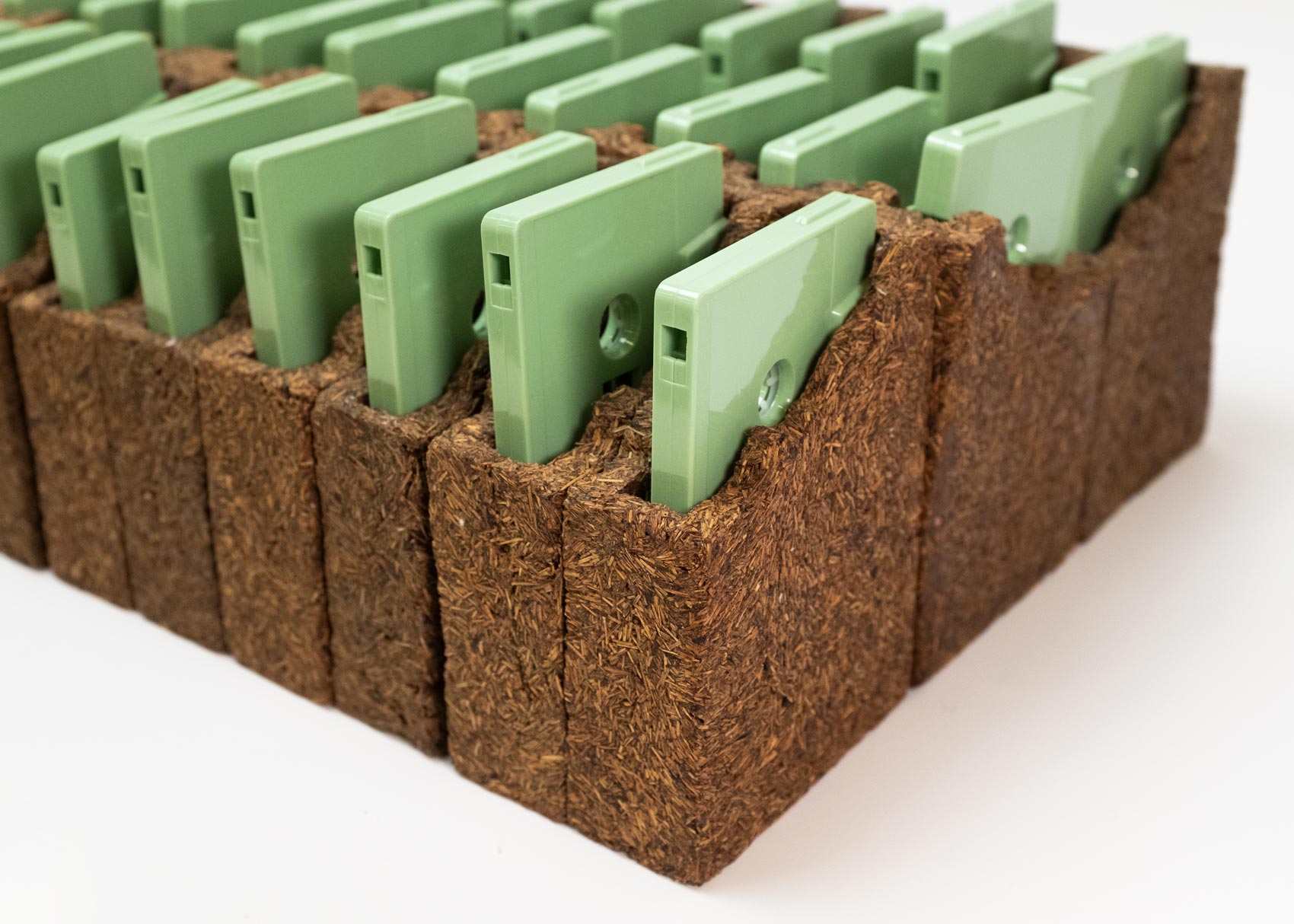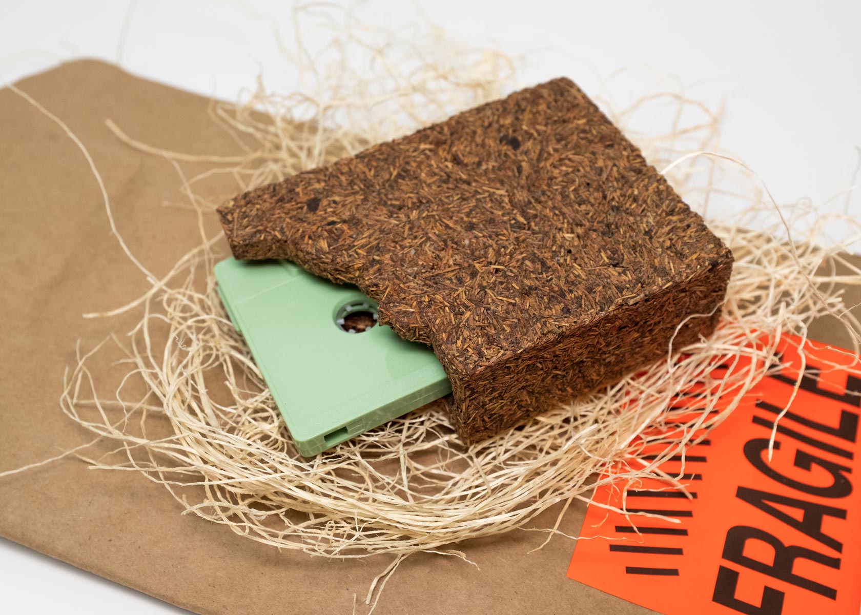 Cassette tapes housed inside a fully biodegradable sculpture made from collected pine needles, Pine resin, and starch.