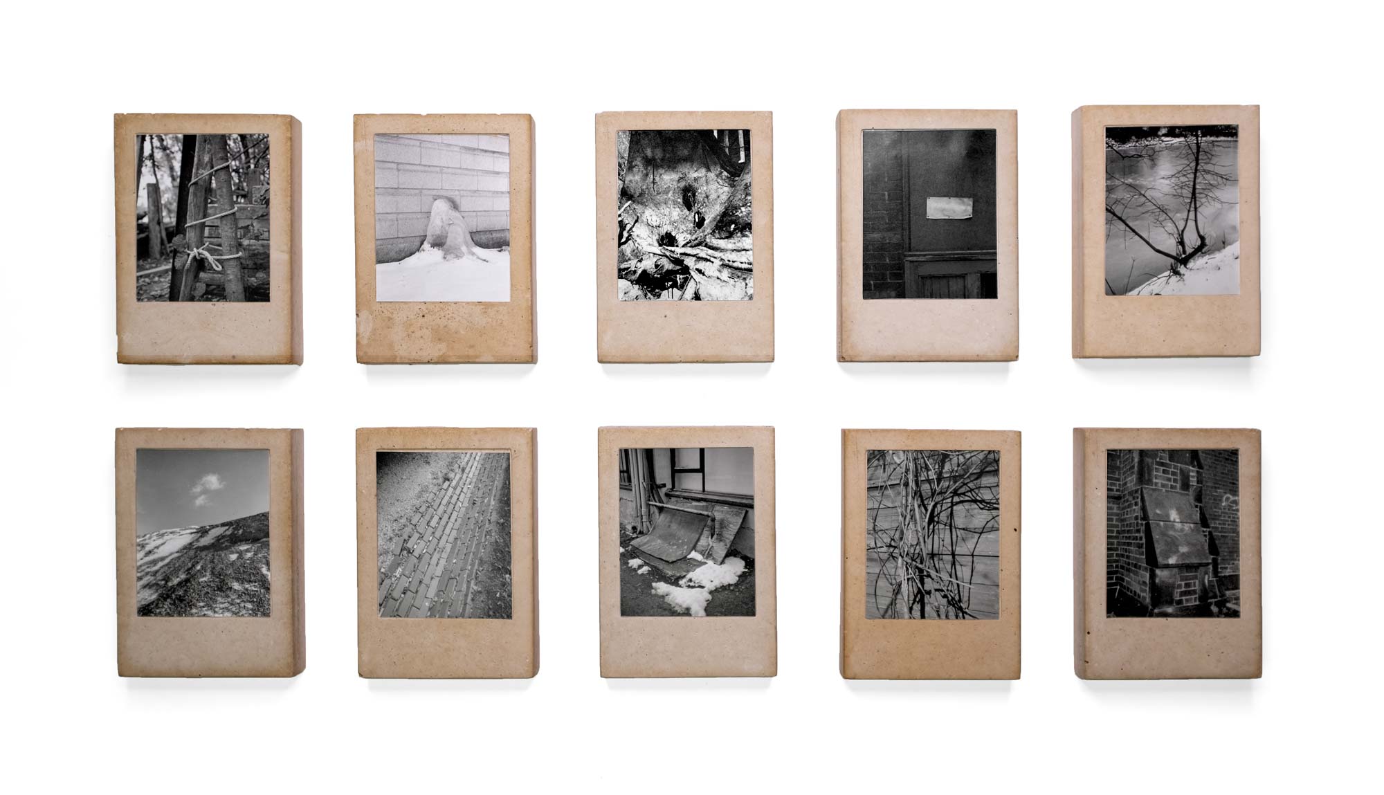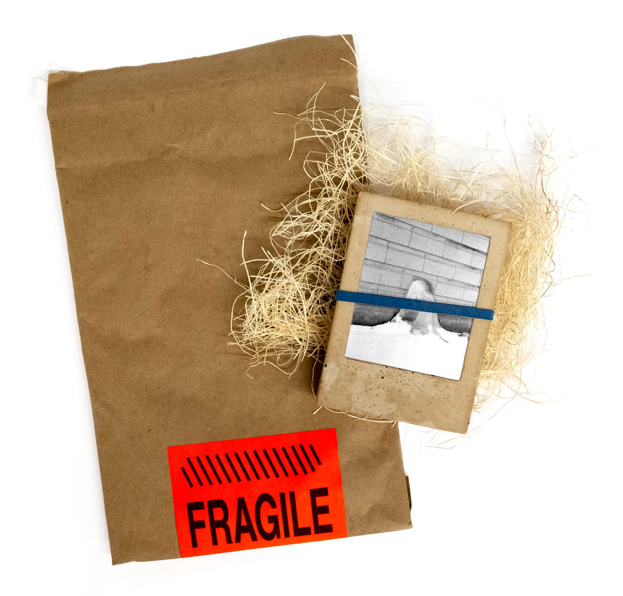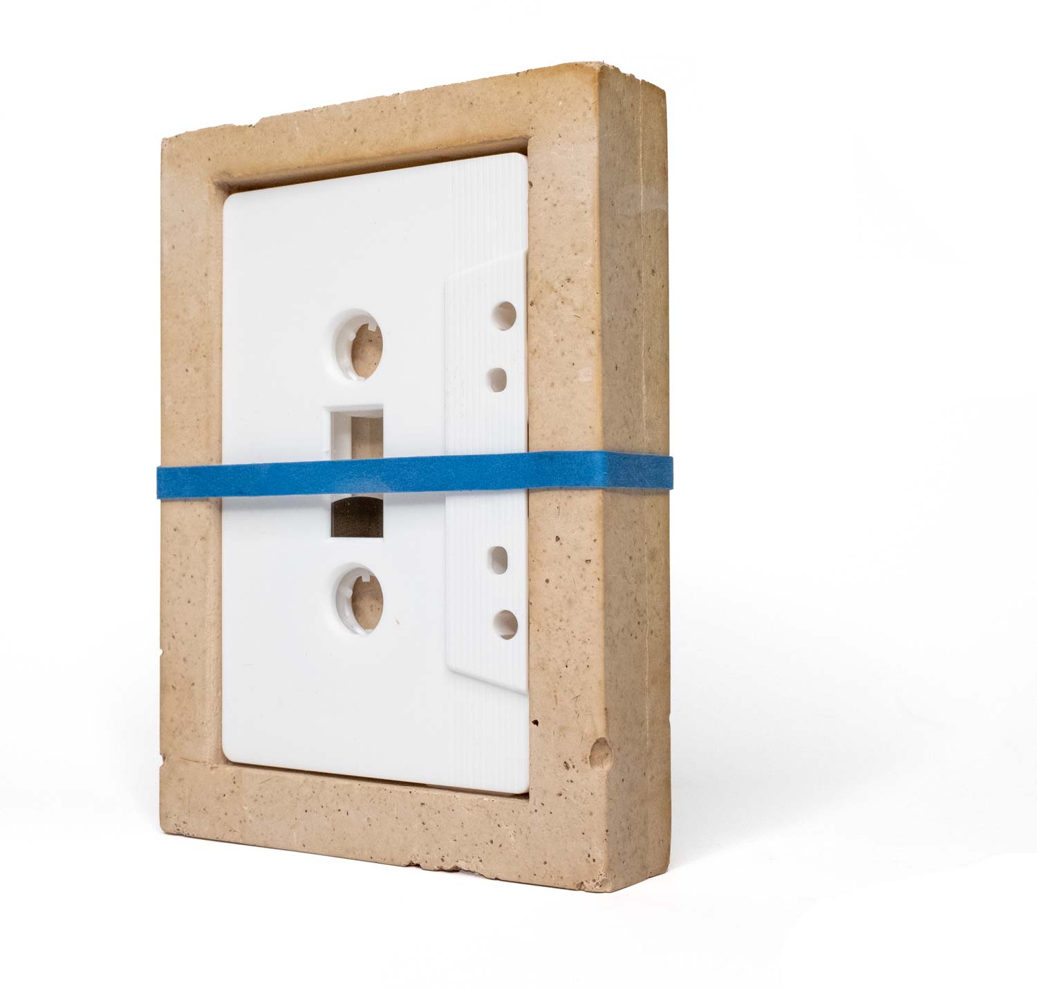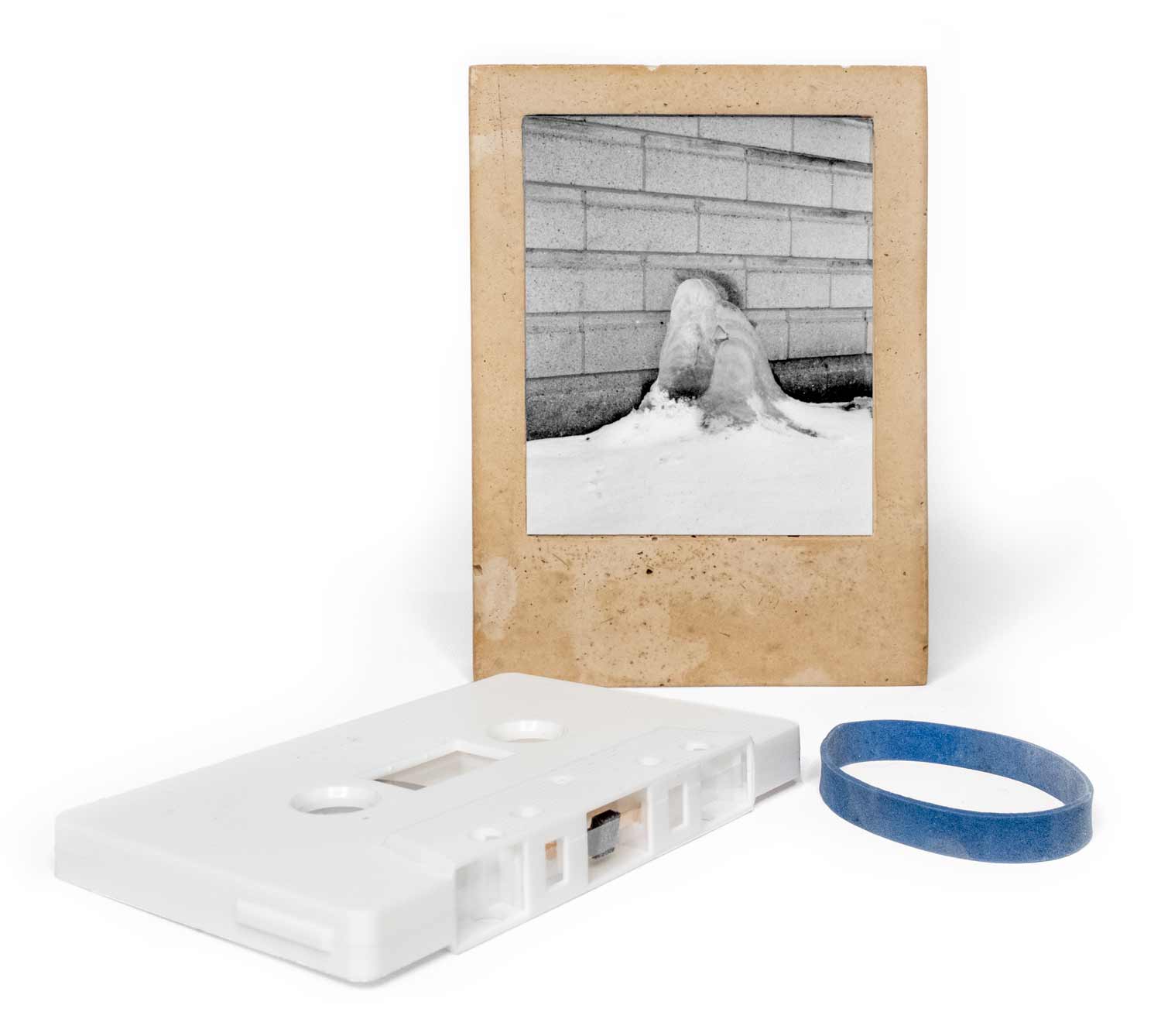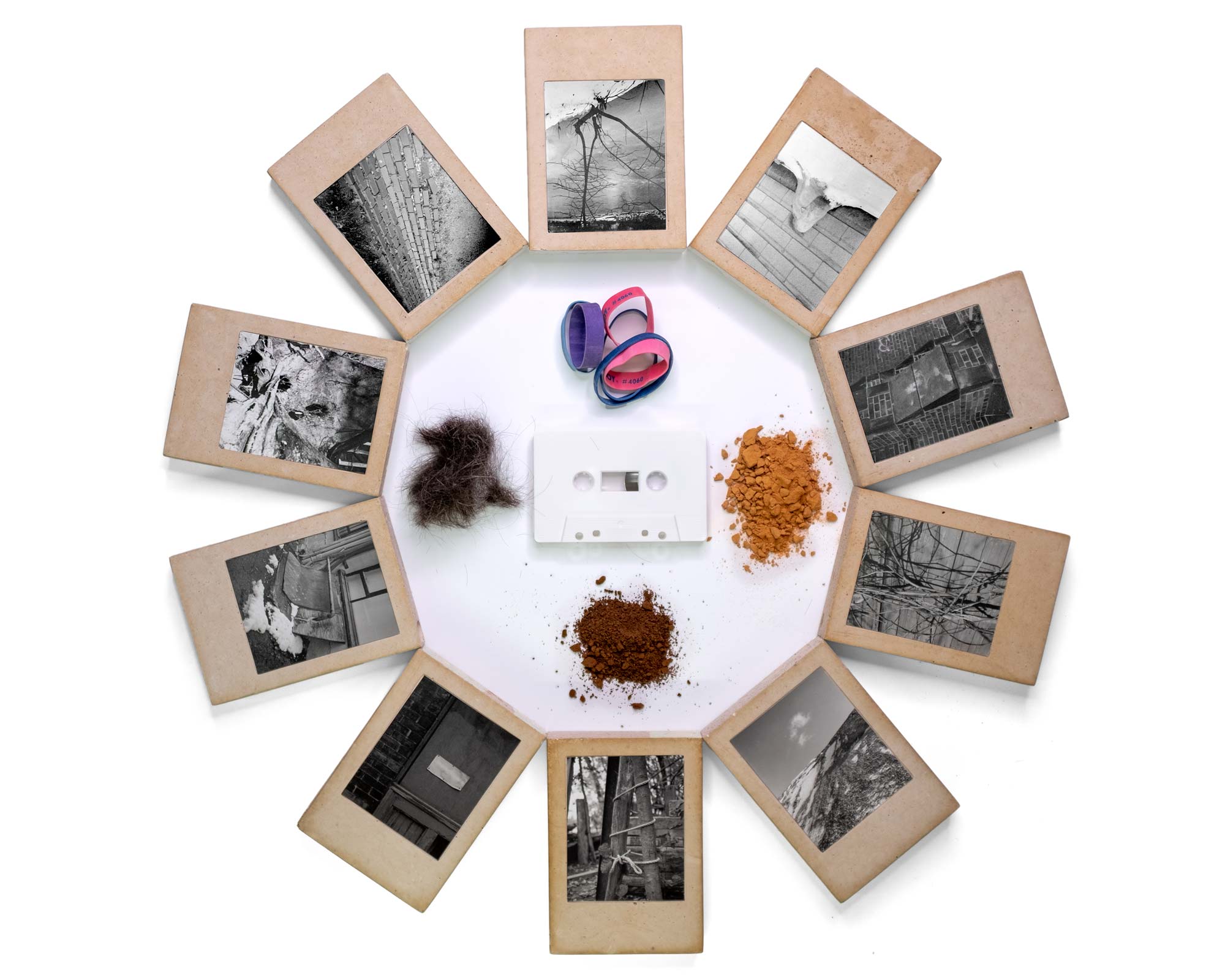 Cassette tape housed in a sculpture made of construction debris collected on daily walks, Used coffee grounds from artists daily coffee, artists hair that was grown and cut during this period of time, and one of 10 different hand printed silver gelatine photos by Cristian Ordóñez.